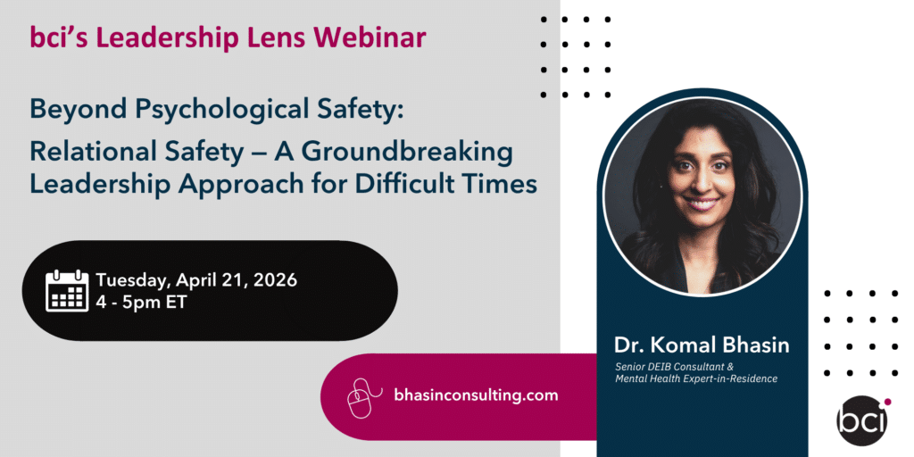 bhasin consulting inc. (bci) is pleased to share that Relational Safety will be the focus of our April Leadership Lens webinar. Join us on Tuesday, April 21, 2026, from 4–5pm ET, as Dr. Komal Bhasin, bci’s Mental Health Expert-in-Residence, presents Beyond Psychological Safety: Relational Safety — A Groundbreaking Leadership Approach for Difficult Times.